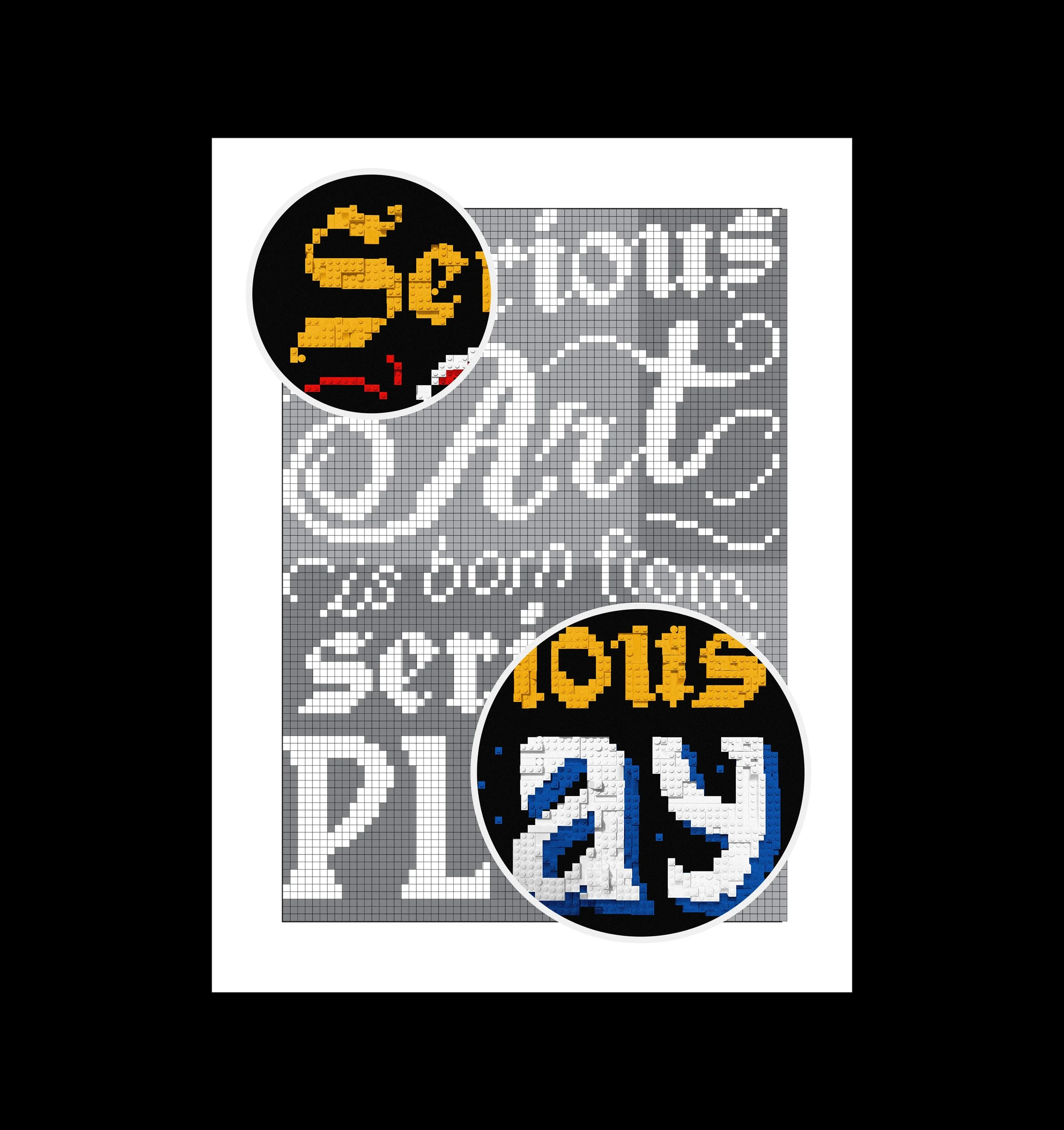 This poster design is inspired by a quote from The Artist’s Way by Julia Cameron. This was a great exercise in problem solving. I started by planning out pixel-style lettering on a grid. Then, I got to building the letters. I quickly realized I’d need a more apartment-friendly solution, and had to photoshop the rest of the lego shapes.