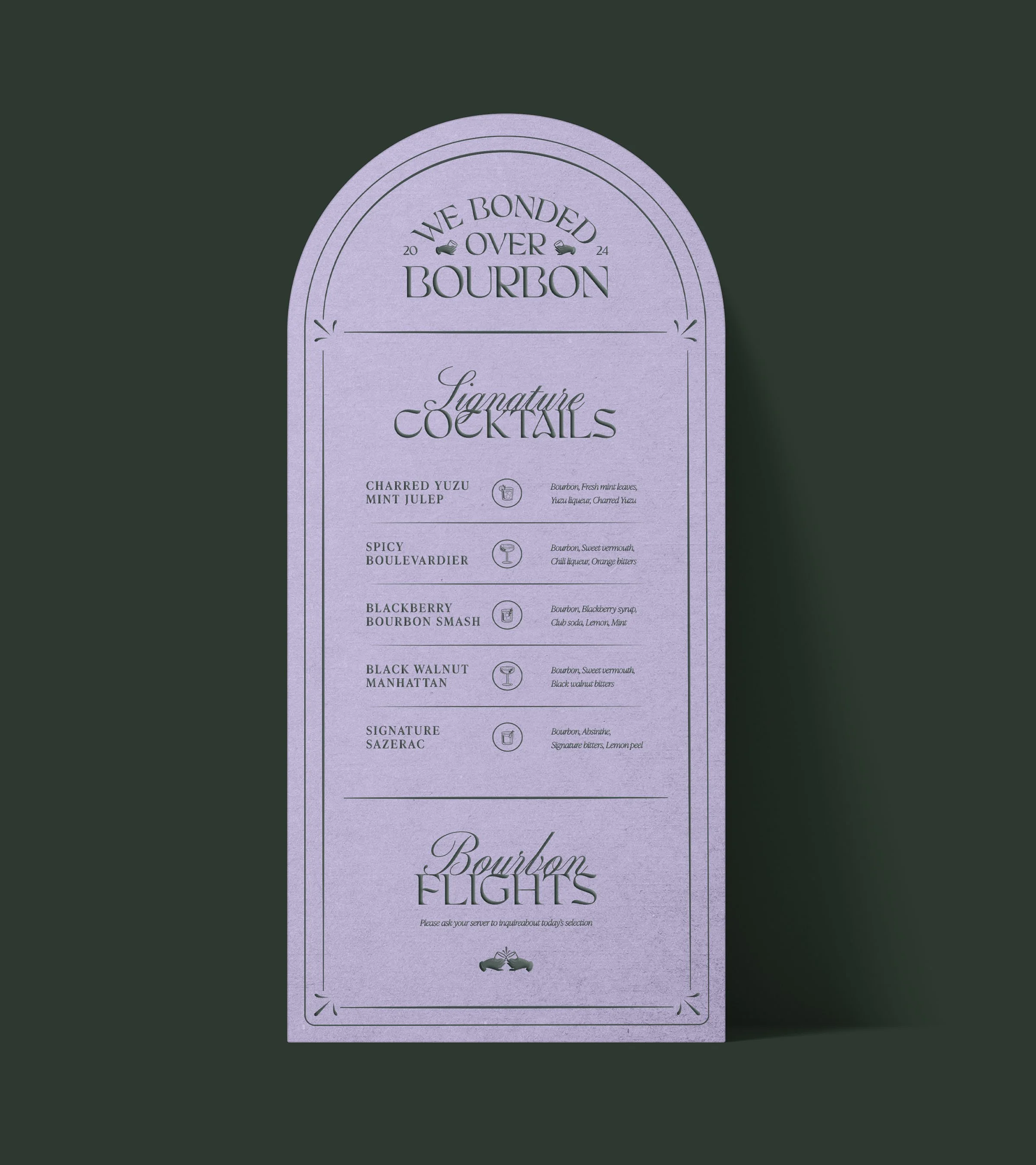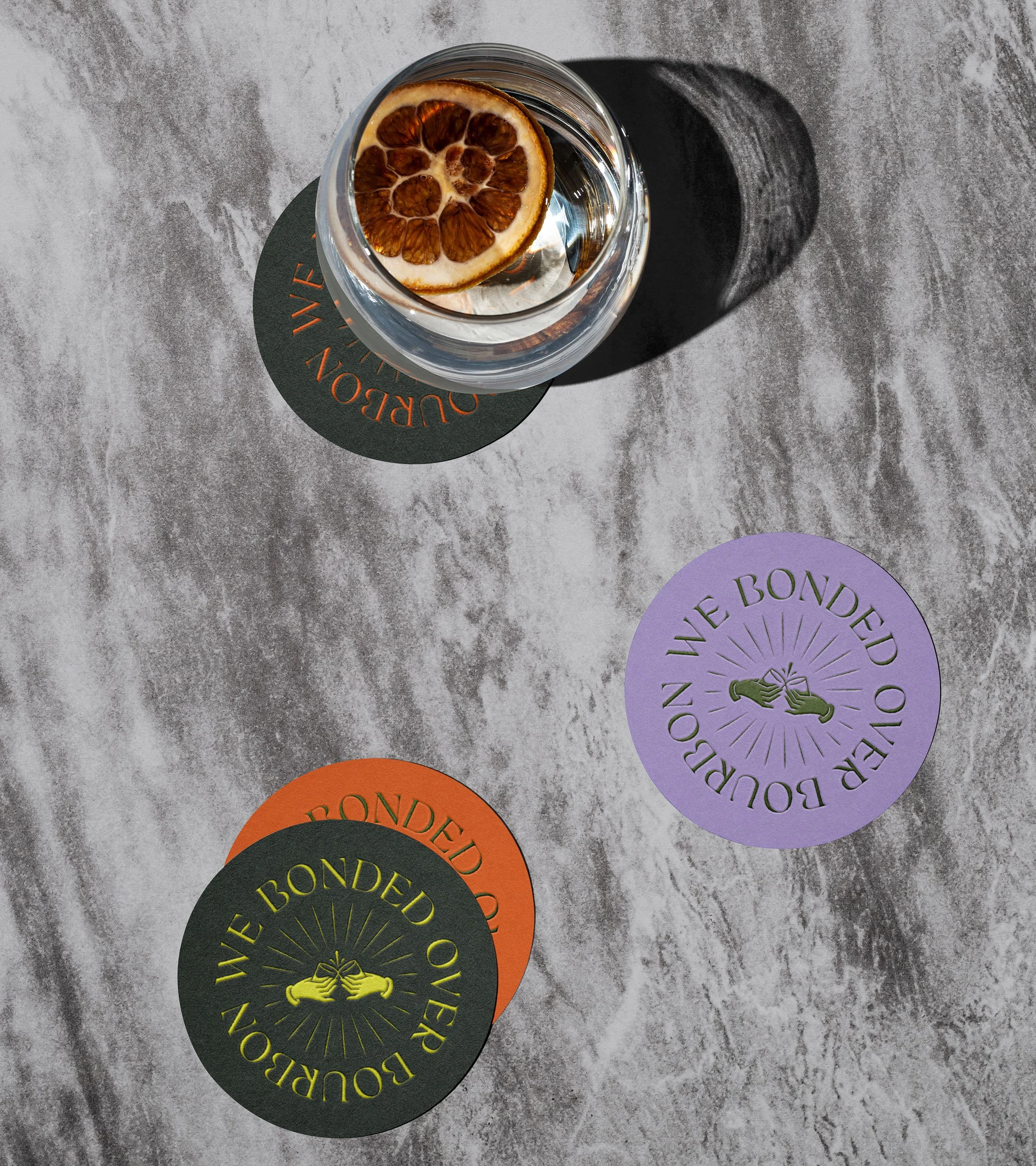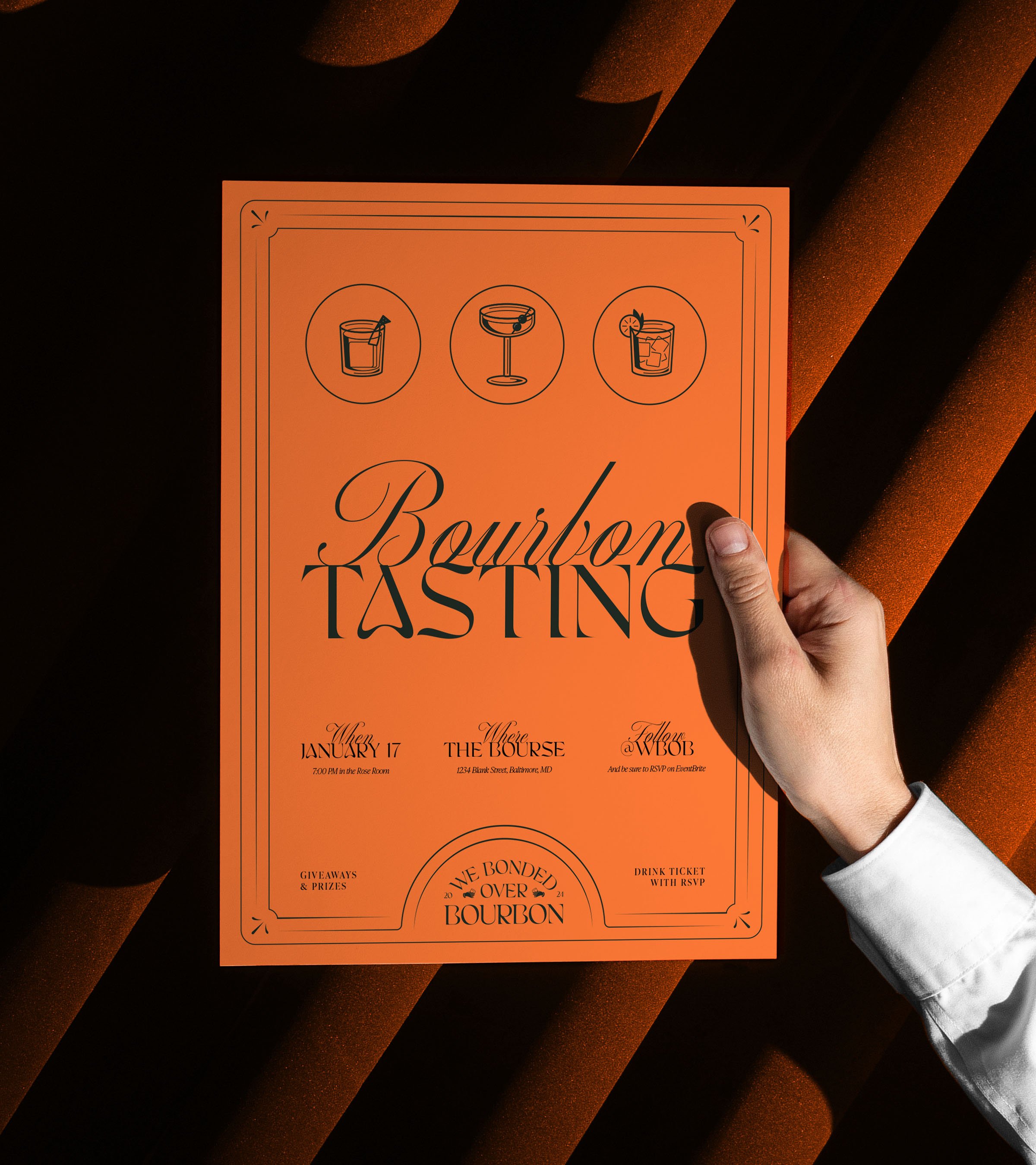 We Bonded Over Bourbon is a networking happy hour hosted in the city of Baltimore. The event series includes craft cocktails and local bourbon tastings for young professionals. Art deco-inspired linework and illustration are paired with bright colors to create a youthful yet refined brand identity.
